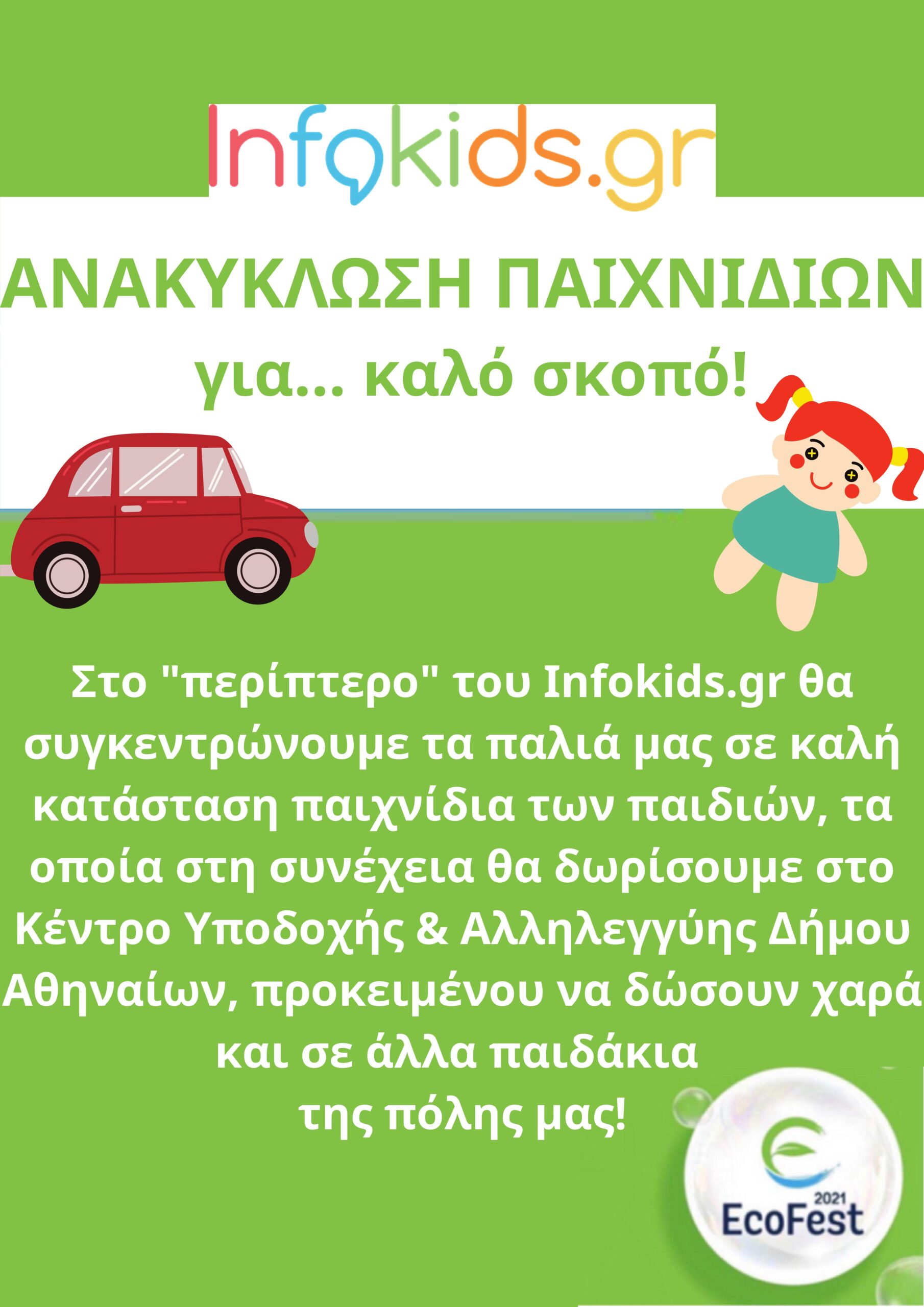 Με αυτή τη σκέψη το infokids.gr, υλοποιεί τη δράση ΑΝΑΚΥΚΛΩΣΗ ΠΑΙΧΝΙΔΙΩΝ ΓΙΑ… ΚΑΛΟ ΣΚΟΠΟ, συγκεντρώνοντας μεταχειρισμένα (αλλά σε καλή κατάσταση) παιχνίδια για τα παιδιά που υποστηρίζονται από το Κέντρο Υποδοχής και Αλληλεγγύης του Δήμου Αθηναίων.
