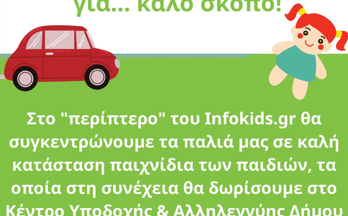 Η δωρεά των παιχνιδιών με τα οποία έπαιξαν τα παιδιά μας δεν συνιστά μόνο πράξη αλληλεγγύης, αλλά και ενέργεια προστασίας του περιβάλλοντος. Με αυτή τη σκέψη το infokids.gr, υλοποιεί τη δράση ΑΝΑΚΥΚΛΩΣΗ ΠΑΙΧΝΙΔΙΩΝ ΓΙΑ… ΚΑΛΟ ΣΚΟΠΟ, συγκεντρώνοντας μεταχειρισμένα (αλλά σε καλή κατάσταση) παιχνίδια για τα […]