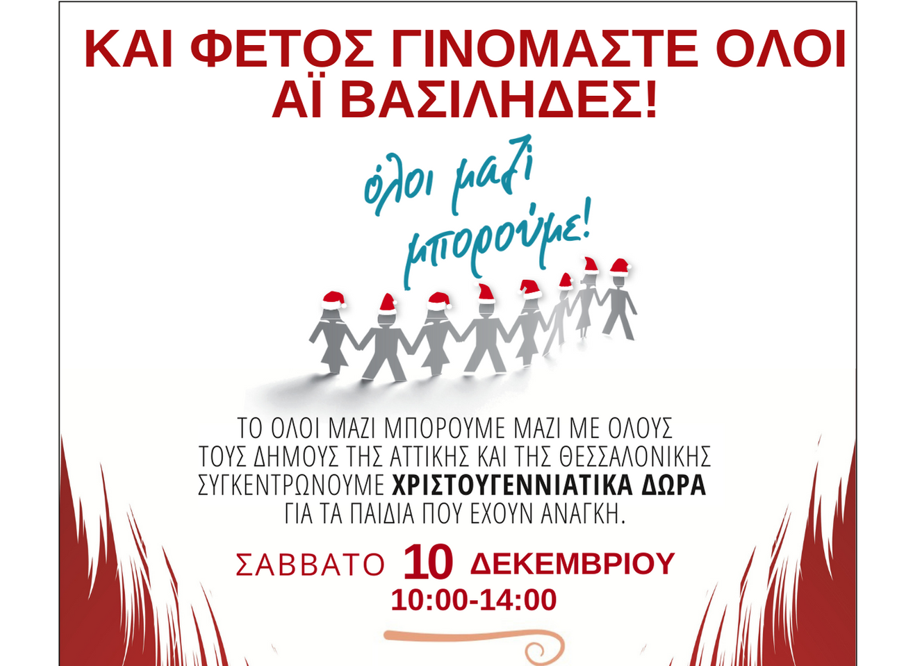 Συμμετέχουμε στη μεγάλη δράση του ΟΛΟΙ ΜΑΖΙ ΜΠΟΡΟΥΜΕ και διοργανώνουμε συγκέντρωση χριστουγεννιάτικων δώρων, ώστε να μην αφήσουμε κανένα παιδί χωρίς το δώρο του.