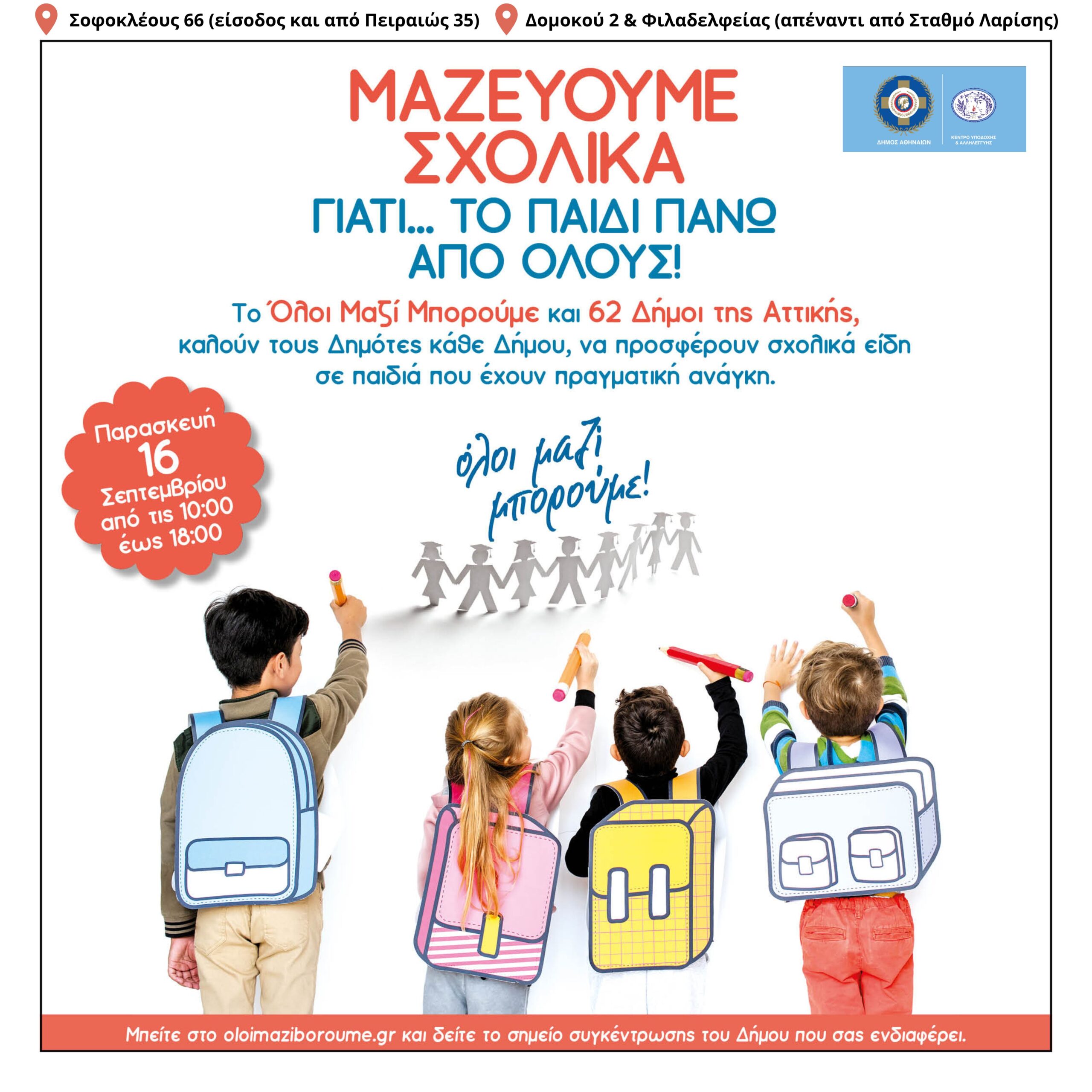 Ο Δήμος Αθηναίων μέσω του Κ.Υ.Α.Δ.Α. συμμετέχει στη δράση του «Όλοι Μαζί Μπορούμε» και συγκεντρώνει τσάντες, μολύβια, τετράδια, στυλό, μαρκαδόρους, χάρακες, μπλοκ ζωγραφικής και όλα όσα χρειάζεται κάθε μαθητής.